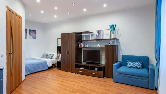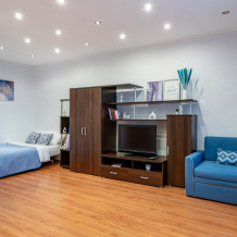 В комнате двуспальный диван и раскладное кресло, кухонная зона. Бесплатный Wi-Fi. В прихожей зоне большое зеркало, пуф и вешалки для одежды.