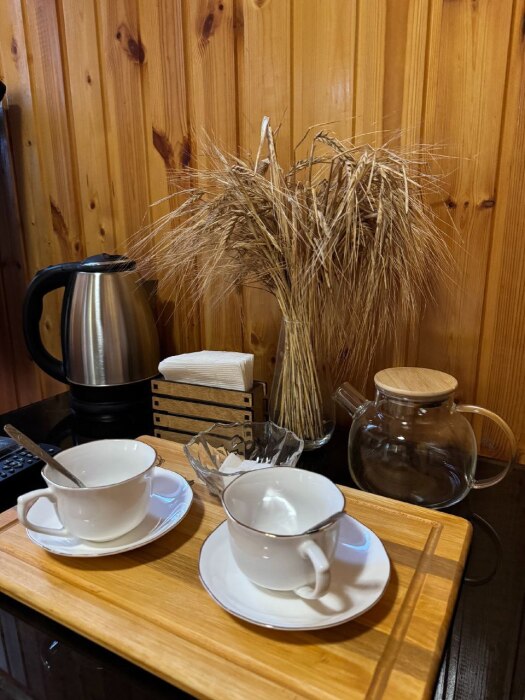 В номерах есть чайные наборы: бутилированная вода, чашки с блюдцами, чай черный и зеленый, сахар.