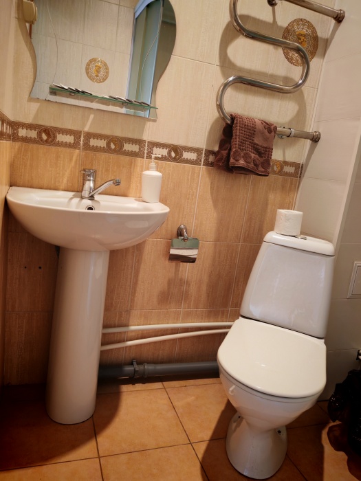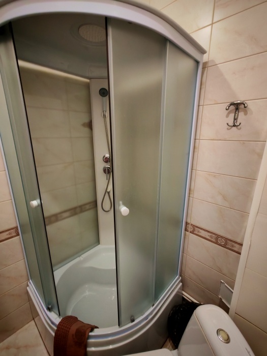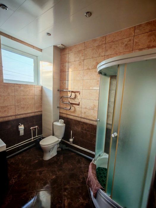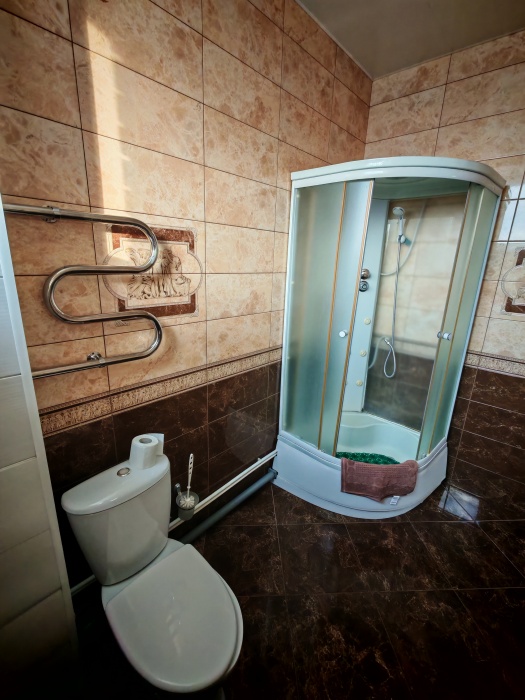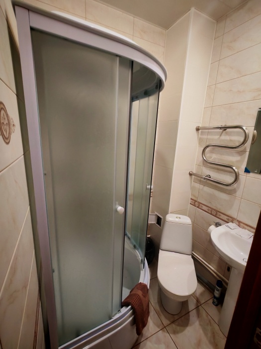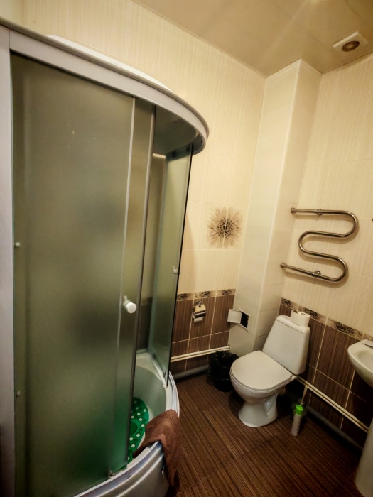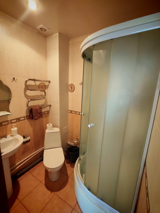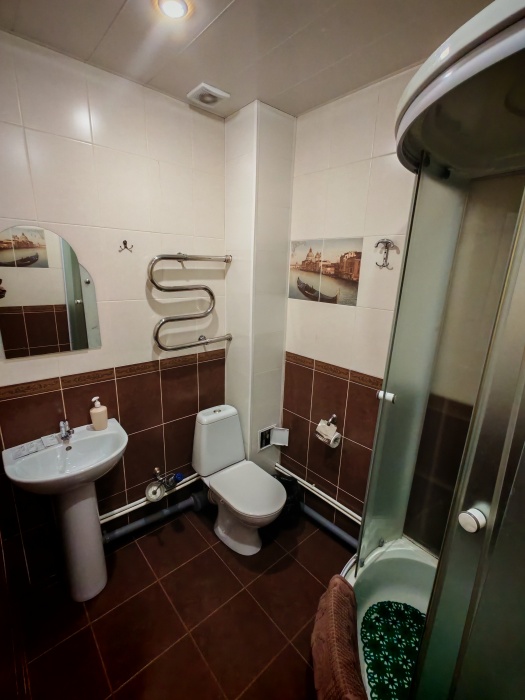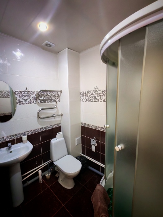 Ванная комната с душевой кабиной, умывальником и туалетом, гигиеническими принадлежностями и комплектом полотенец.