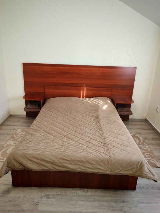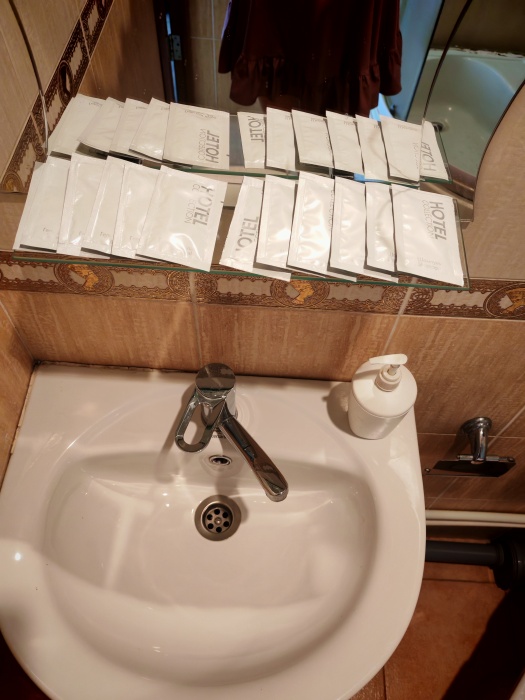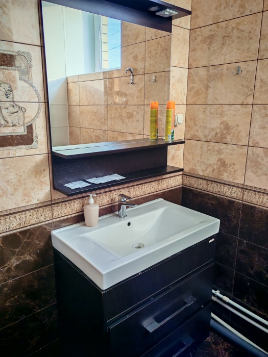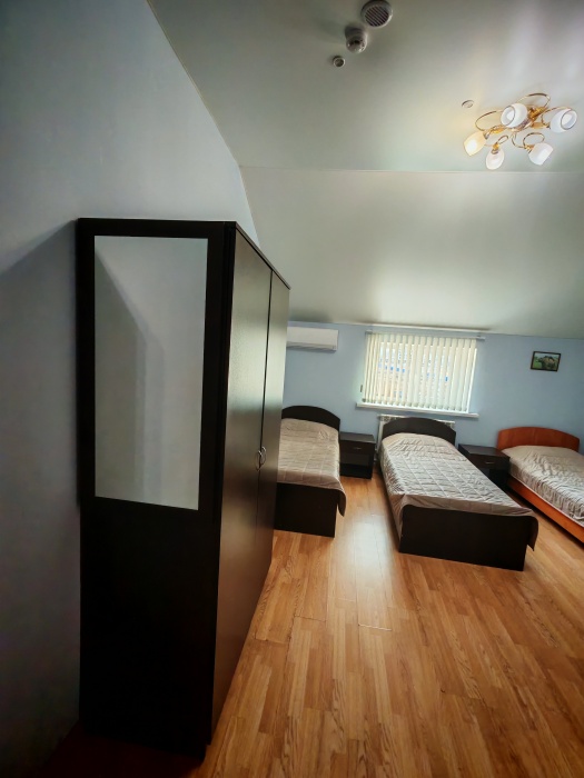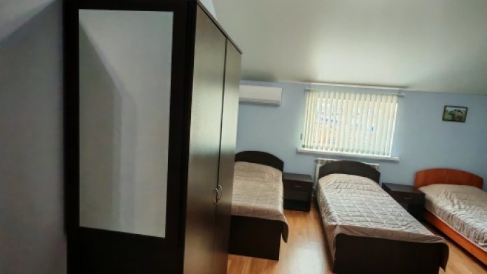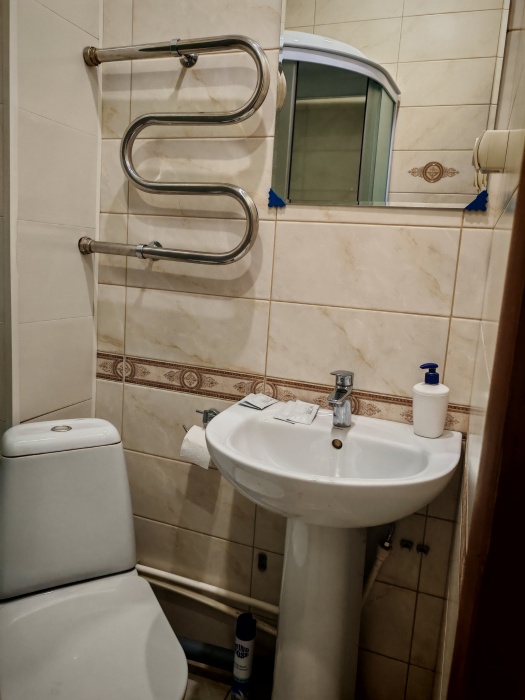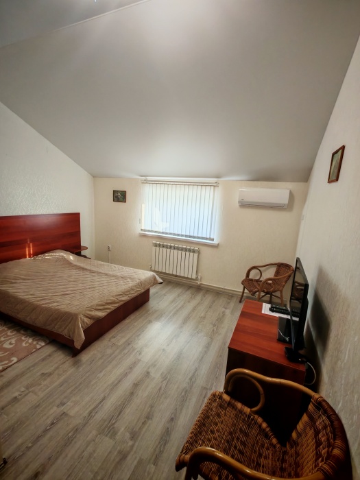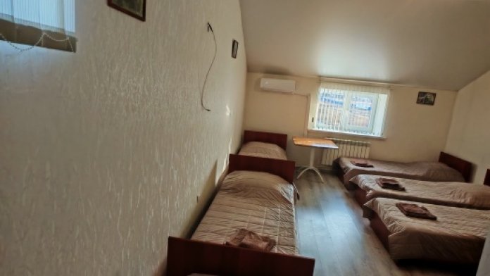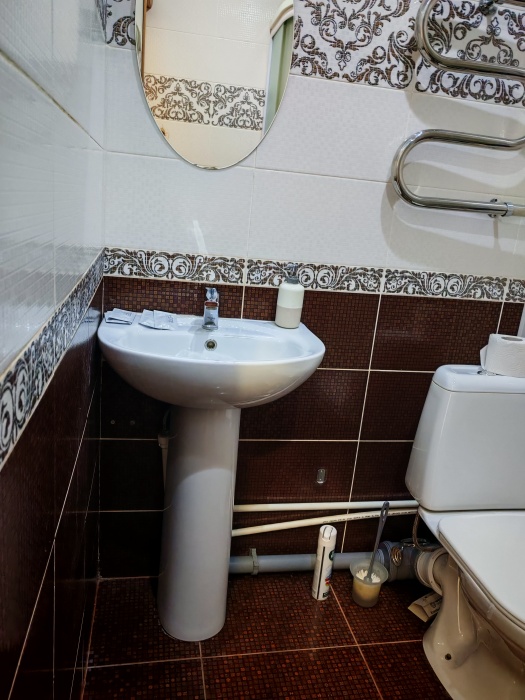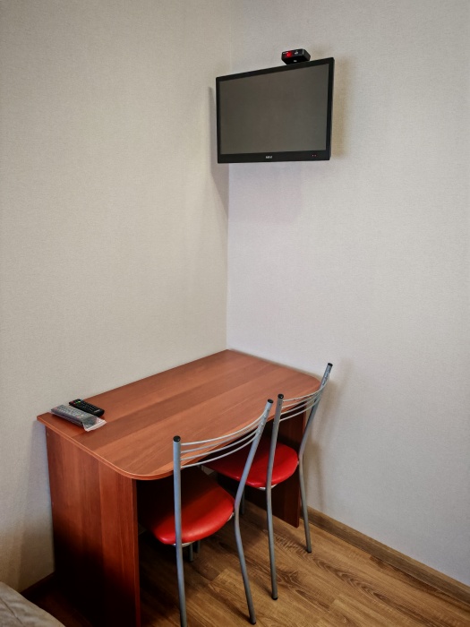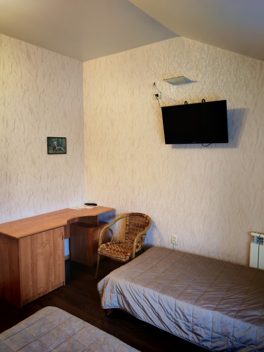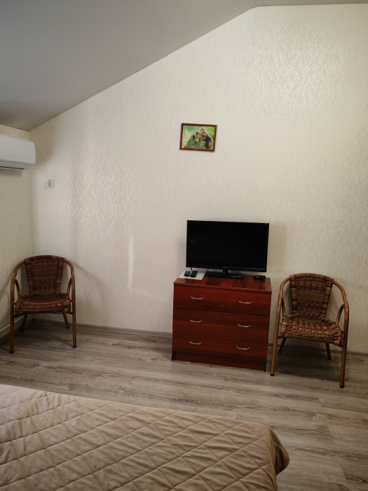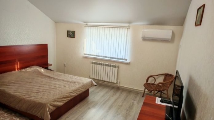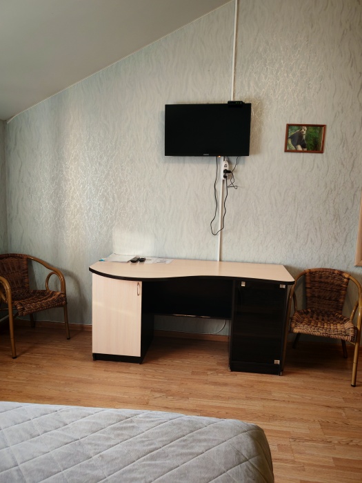 В номерах есть телевизор, кондиционер, чайные наборы: бутилированная вода, чашки с блюдцами, чай черный и зеленый, сахар.