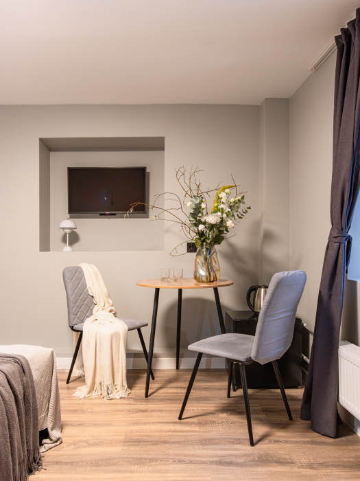 Дуплекс номера отеля комфортабельные и двухэтажные. Номера оборудованы одной большой двухспальной кроватью и диваном на втором уровне. Все номера выполнены в соответствии с современными европейскими тенденциями и оформлены в авторском стиле. В каждом номере есть ванная комната. Номера выполнены в спокойных тонах. Площадь составляет 20 - 22 кв.м. Номера располагают рабочим местом со столом и стулом.