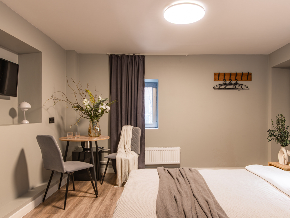Номер оборудован маленьким окном и оформлен в спокойных тонах. Пространство организовано так, чтобы обеспечить гостям всё необходимое для комфортного пребывания. В номере: электрочайник, телевизор с поддержкой Smart, зеркало, комплект полотенец, набор гигиенических средств, тапочки, бокалы.