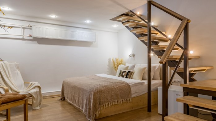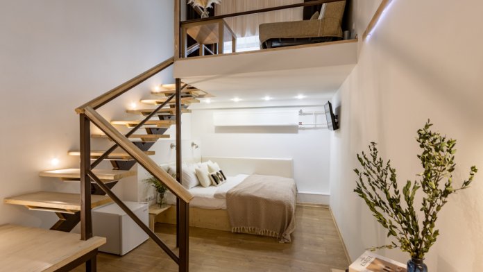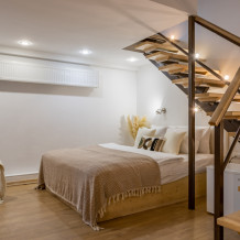 Дуплекс номера отеля комфортабельные и двухэтажные.Номера оборудованы одной большой двухспальной кроватью.Все номера выполнены в соответствии с современными европейскими тенденциями и оформлены в авторском стиле. В каждом номере есть ванная комната. Номера выполнены в спокойных тонах. Площадь составляет 20 - 22 кв.м. Номера располагают рабочим местом со столом и стулом. Дополнительное спальное место, диван на втором уровне.