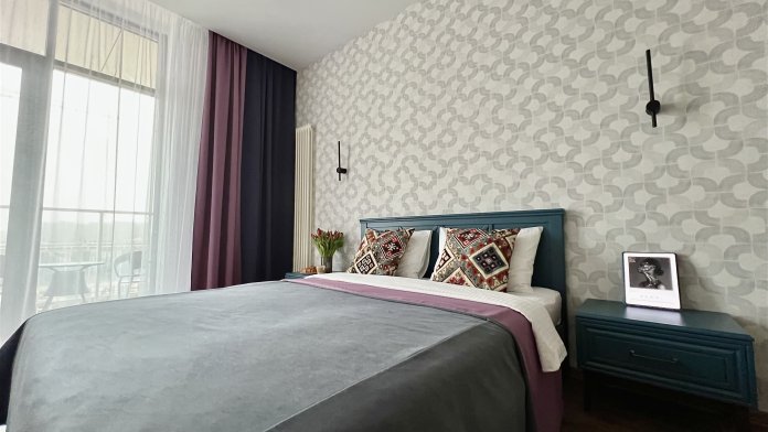 В спальне шикарная кровать с анатомическим матрасом и удобными подушками, что позволит Вам отлично выспаться. Размеры кровати 160*200.