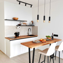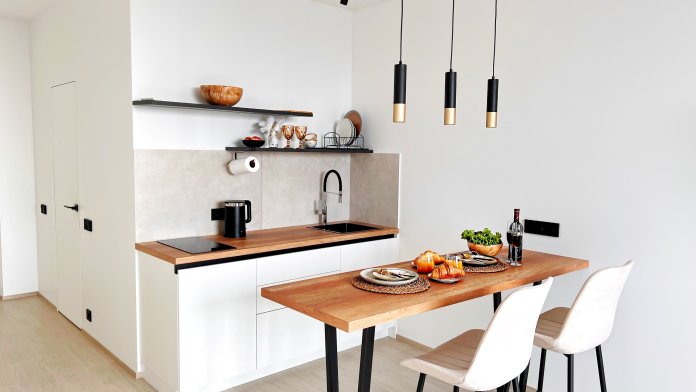 Мы создали кухню со всем необходимым - есть чайник, варочная панель и микроволновка, а также большой холодильник. Мы подготовили разную посуду для приготовления и сервировки. В шкафчиках Вас также будет ждать чай и кофе, сахар, специи, масло.