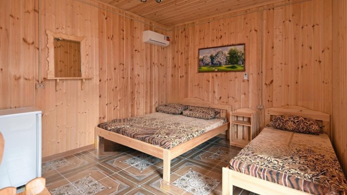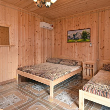 В номере двуспальная кровать, односпальная кровать, телевизор, шкаф, санузел, возможна установка доп. места. У каждого номера свой столик на веранде перед входом в номер.