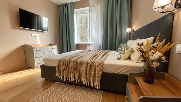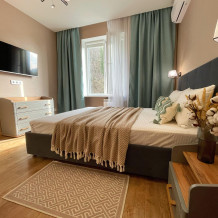 - Уютная спальня: просторная двуспальная кровать с комфортным матрасом 160*200 обеспечит крепкий сон.