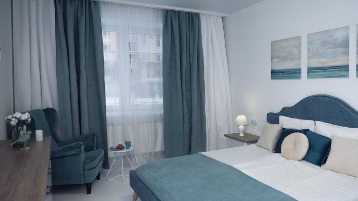 В апартаментах лаконичный европейский интерьер, есть вся необходимая техника для комфортного проживания. Предусмотрено дополнительное спальное место - раскладушка.