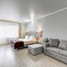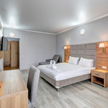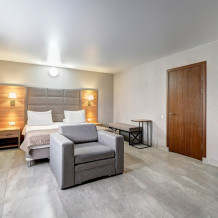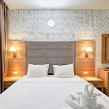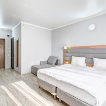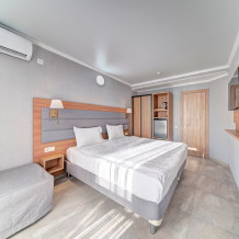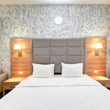 Трёхместный номер с тремя спальными местами: двуспальной кроватью с мягким изголовьем и ортопедическим матрасом, также с раскладывающимся креслом-кроватью, прикроватными тумбочками с индивидуальным освещением.