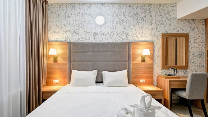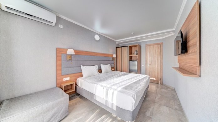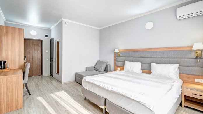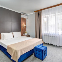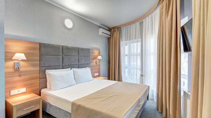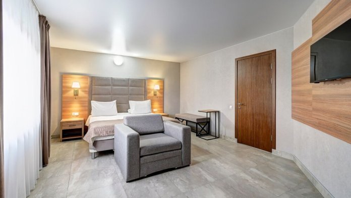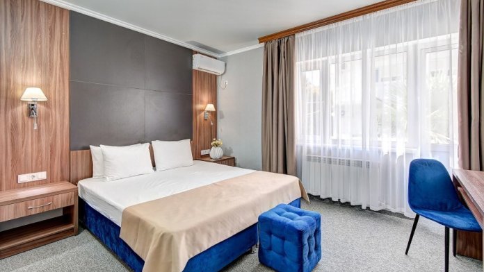 Двухместный номер оборудован системой индивидуального кондиционирования, кроватью с ортопедическим матрасом и мягким изголовьем с возможностью разделения на две кровати, рабочим столом, беспроводным интернетом WI-FI, принадлежностями для приготовления чая, холодильником, электронным сейфом и телевизором с плоским экраном и Smart TV.