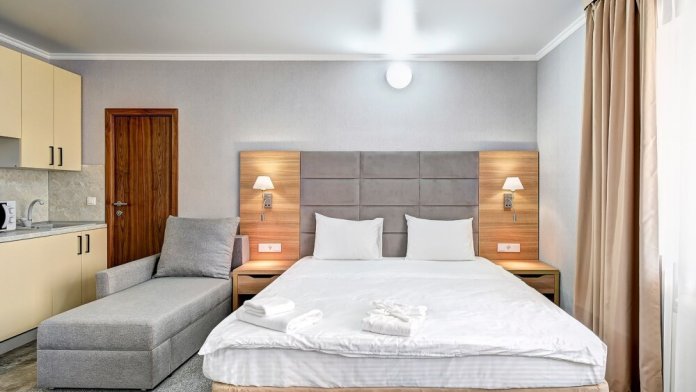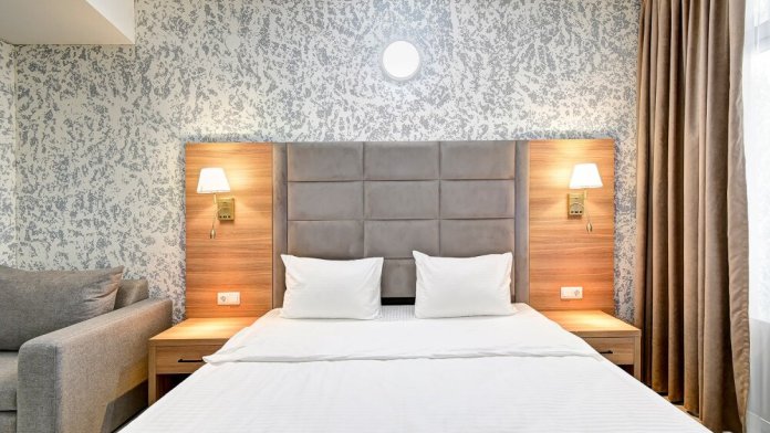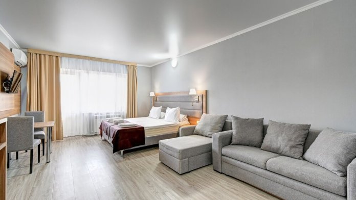 Стандартный однокомнатный номер площадью оформлен в современном стиле, интерьер выполнен в светлых тонах. Номер оснащён удобной двуспальной кроватью с ортопедическим матрасом, прикроватными тумбочками с индивидуальным освещением, пуфом, который используется как дополнительное место, столиком, электронным сейфом и системой автоматического кондиционирования.