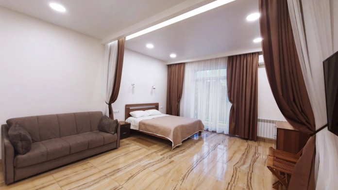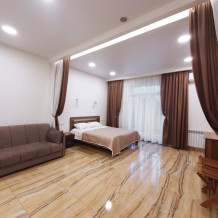 Квартира оборудована всем необходимым для комфортного проживания: кроватью, диваном, стиральной машиной, утюгом, гладильной доской, феном, гигиеническим душем, кондиционером с функцией обогрева, большим зеркалом, вместительным шкафом. Кухня оборудована – холодильником, микроволновой печью, электрическим чайником, плитой, кофеваркой. Есть балкон со столиком и стульчиками для отдыха на свежем воздухе, для комфорта имеется плед. Предоставляют полотенца, постельное белье и одноразовые тапочки.