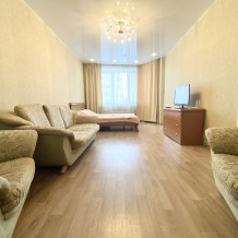 В квартире: двуспальная кровать, диван-кровать, стол, журнальный столик, ТВ (кабельное 105 каналов), Wi-Fi, безлимитный интернет. Чистое постельное белье, полотенца, (в стоимость входит 1 комплект) гладильная доска, сушилка, утюг. Пол квартиры покрыт линолеумом, в окнах установлены пластиковые стеклопакеты. Кухня оснащена: кухонный гарнитур, электрическая и микроволновая печи, эл. чайник, холодильник, сделают приготовление любимой пищи максимально комфортным. Комплект посуды - по количеству проживающих. Ванная комната: Ванна/душ, фен по запросу.