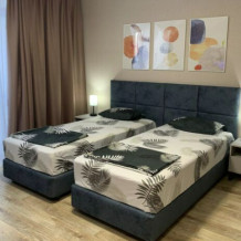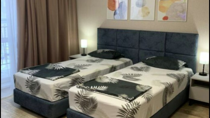 Студия с 3 спальными раздельными местами. Двуспальная кровать она же и разбирается на две односпальные кровати , очень удобный матрац .В квартире вся бытовая техника, машинка автомат , микроволновая печь ,гладильная доска утюг , шкаф для вещей .