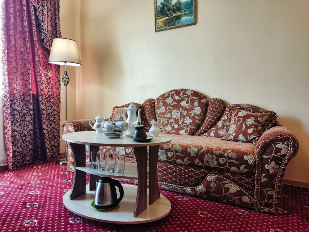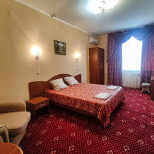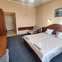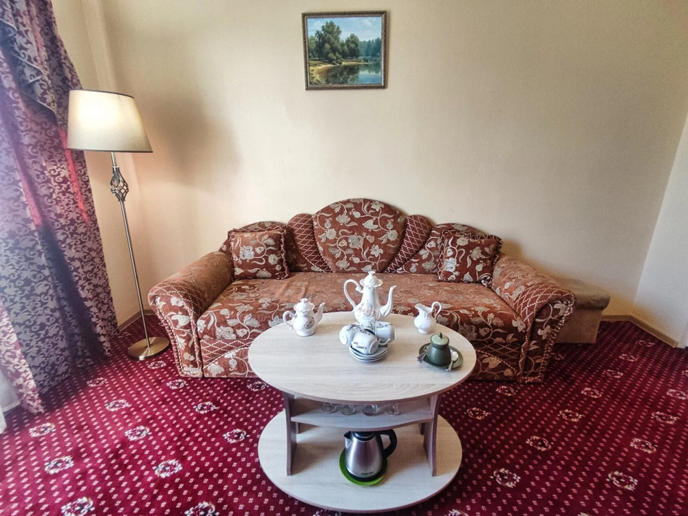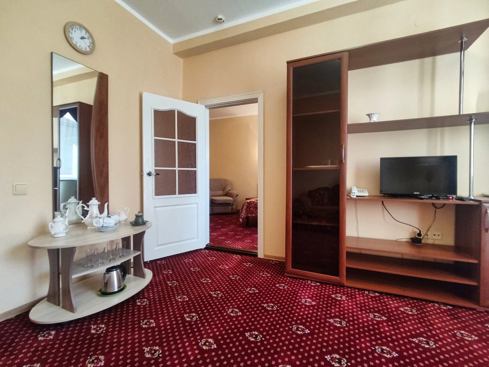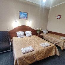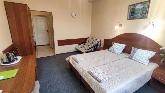 В номере есть всё необходимое для комфортного проживания. В спальне находится двуспальная кровать, на которой могут разместиться два взрослых и ребёнок до 5 лет без дополнительной платы. Также имеется односпальная кровать, что позволит Вам разместиться в номере семьёй.