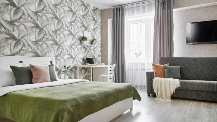 два раздельных спальных места для четверых гостей: удобная кровать 160×200 и диван 140×200;
