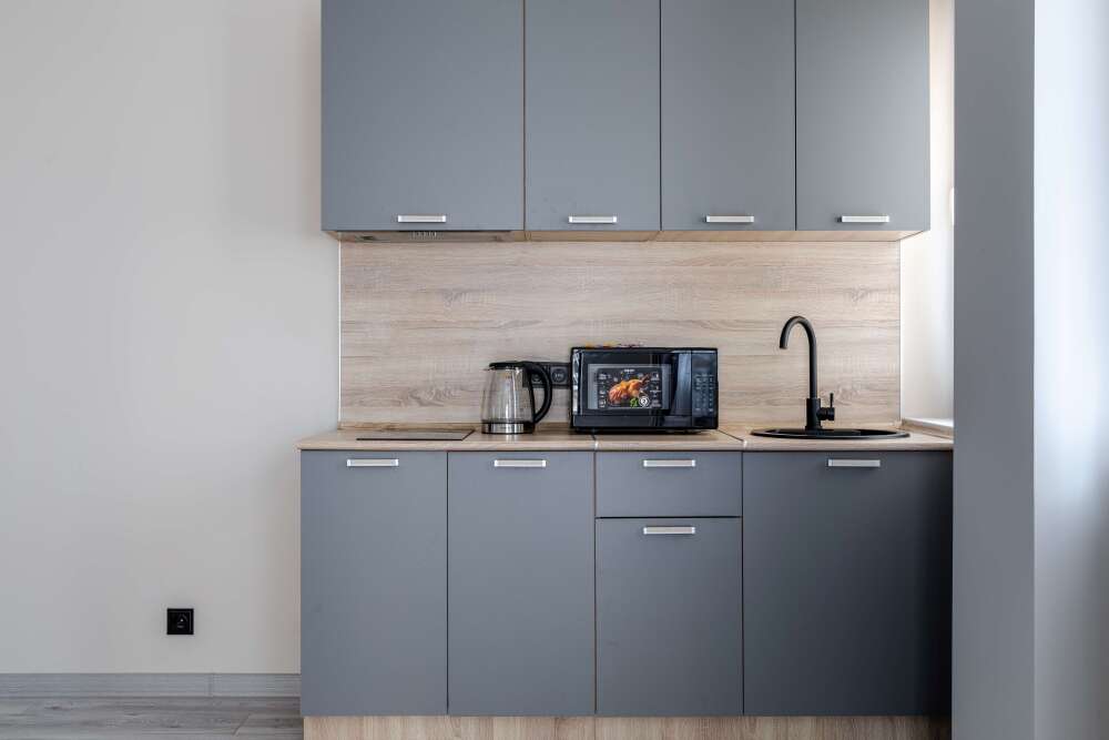 Уютный однокомнатный номер с двуспальной кроватью и кухонной зоной. Один ребёнок до 5 лет — можно без отдельного спального места.