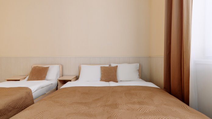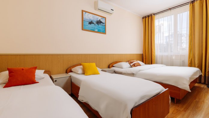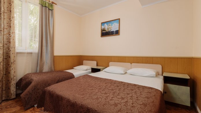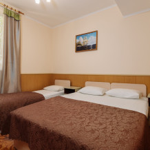 Комфортный, светлый номер, в котором могут разместиться до 3 гостей. В комнате одна двуспальная и две односпальные кровати .