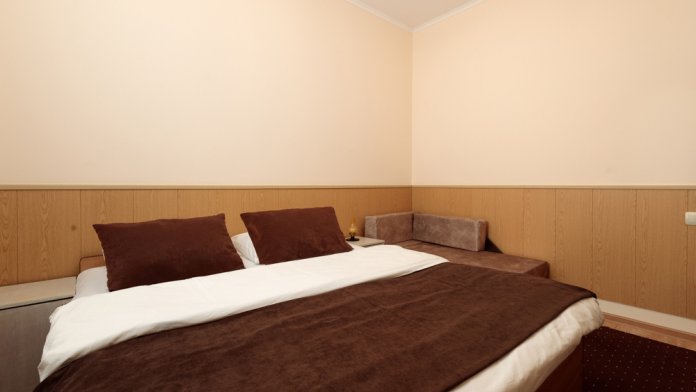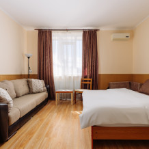 Комфортный, светлый номер, в котором могут разместиться до 3 гостей. В комнате одна двуспальная кровать, небольшой раскладной диван-софа.