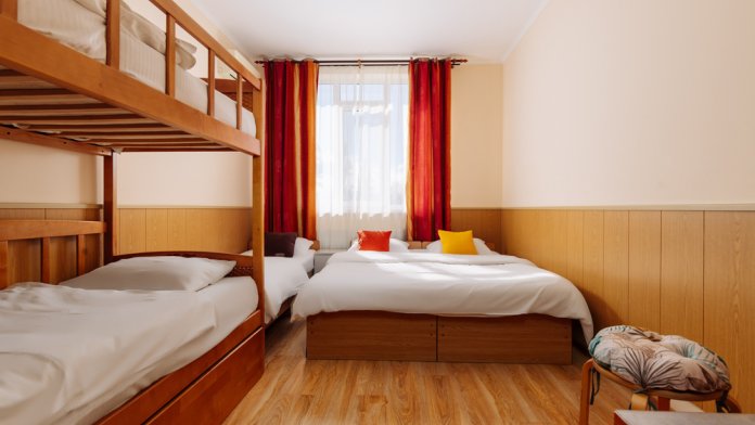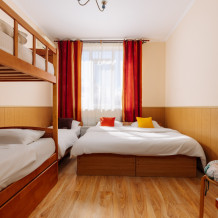 Комфортный, светлый номер, в котором могут разместиться до 5 гостей. В комнате одна двуспальная и одна односпальная кровати, а также одна двухъярусная кровать.