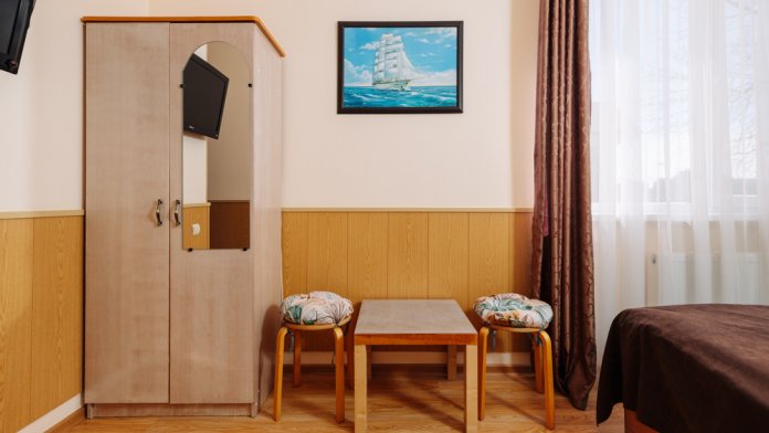 Номер оснащен всем необходимым для комфортного пребывания: телевизор, шкаф для одежды, кондиционер, фен. В ванной комнате совмещённый сан.узел с душевой и всеми необходимыми косметическими принадлежностями. Бесплатный WiFi. На этаже есть общая кухня, в которой есть холодильник, плита, набор необходимой посуды. Номер находится на 3 этаже. Из окна номера открывается прекрасный вид на море.
