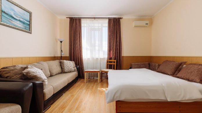 Комфортный, светлый номер, в котором могут разместиться до 5 гостей. В комнате одна двуспальная кровать, диван для 2 гостей и софа для 1 гостя.