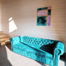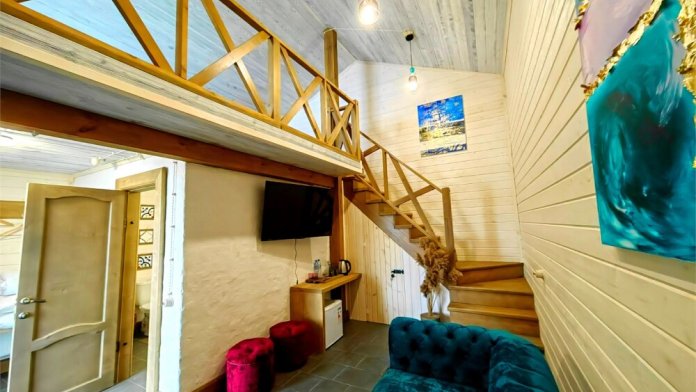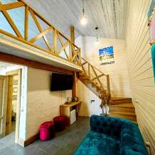 На первом этаже коттеджа находится гостиная с шикарным диваном, ТВ, мини холодильником и чайной станцией, а также, прихожая и туалетная комната.