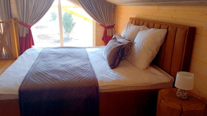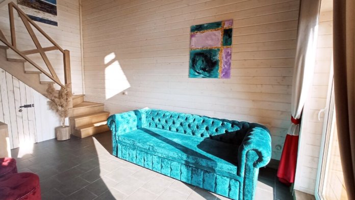 В доме на первом этаже расположены раскладывающийся шикарный диван, два мягких пуфа, телевизор, электрочайник, мини - холодильник, чайная станция, бутилированная вода.
