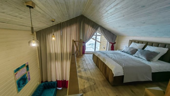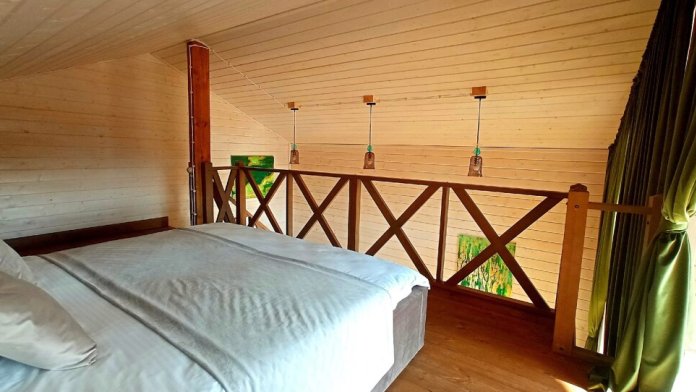 На втором этаже комната оснащена стильной двуспальной кроватью, тумбами и комодом. Авторская живопись на стенах, мебель ручной работы.