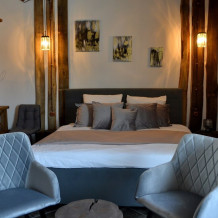 Делюкс - это самые роскошные и тихие номера с кроватями King size в Суздале с просторными ванными комнатами, отделанными амбарной доской и мрамором. Гостей ждет сервировочная база с набором для приготовления кофе и чая, косметические принадлежности.
