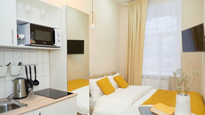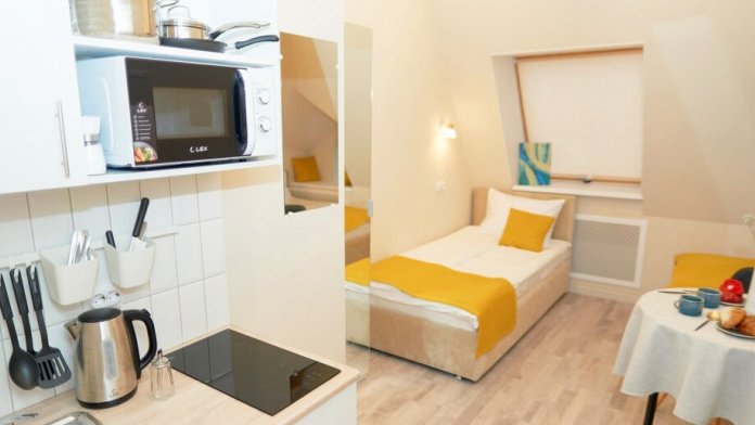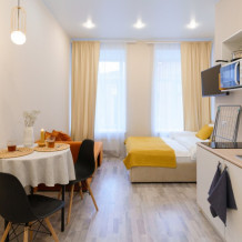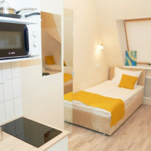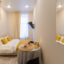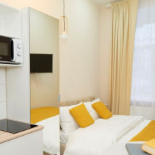 Небольшой и уютный номер, в котором Вы найдете все для комфортного проживания: мини-холодильник, микроволновку, набор посуды для самостоятельного приготовления завтрака или ужина, включая бокалы для вина и штопор, блэк аут шторы для комфортного сна, а также стиральную машину, полотенца, фен, тапочки и средства гигиены.