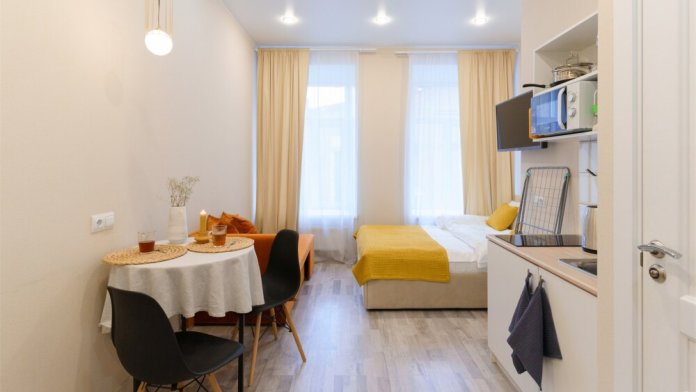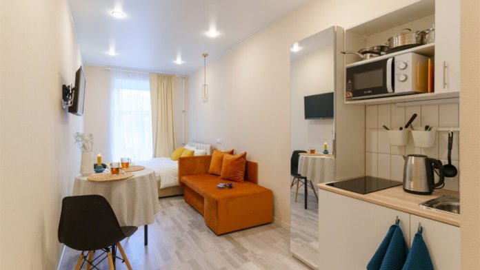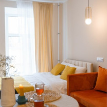 Небольшой и уютный номер с диваном, в котором Вы найдете все для комфортного проживания: мини-холодильник, микроволновку, набор посуды для самостоятельного приготовления завтрака или ужина, включая бокалы для вина и штопор, блэк аут шторы для комфортного сна, а также стиральную машину, полотенца, фен, тапочки и средства гигиены.