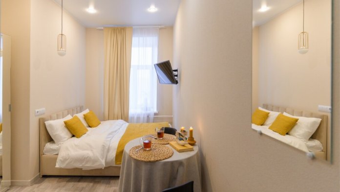 Красивый и уютный номер с двуспальной кроватью и диваном – прекрасное решение для молодой семьи, желающей расположиться по близости от центра Санкт-Петербурга.