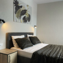 - Спальные места: удобная кровать с ортопедическим матрасом (160х200), раскладное кресло, которое дополнительно подходит для сна