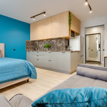 Большая кухонная зона, позволяющая творить свои кулинарные шедевры. Вся техника тоже имеется: микроволновая печь, плита стеклокерамическая, вытяжка, чайник, холодильник. Вся посуда для приема еды и приготовления. Стол и мягкие стулья. В прихожей большой вместительный шкаф.