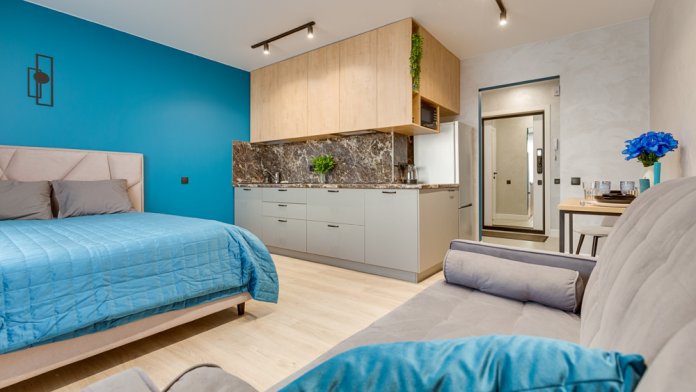 Для удобства есть всё, все мелочи продуманы. Комфортная двуспальная кровать с мягким изголовьем и ортопедическим матрасом. Диван-кровать тоже двуспальный. Большой телевизор со Смарт-тв. Wi-Fi так же есть.