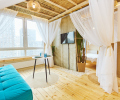 Уютная студия оборудована двуспальной кроватью с новым ортопедическим матрасом и раскладной кроватью.