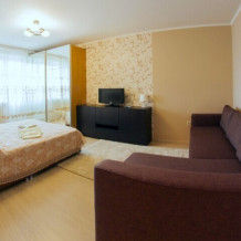 Комфортабельная однокомнатная квартира расположена на улице Холодильной, 118, на 8-ом этаже 9-ти этажного дома, в центральной части Тюмени, около остановок общественного транспорта «Блиц» и «ул. Фабричная». В квартире сделан добротный ремонт, она хорошо меблирована и оборудована всем необходимым для приятного времяпровождения и полноценного отдыха. Спальня выполнена в спокойном стиле, сочетании светлых и золотистых тонов. Кухня решена стильным сочетанием белого и красного, смотрится модерново и технологично, а просторный балкон обшит деревом. В квартире подключено телевидение FullHD и беспроводной WI-FI интернет.