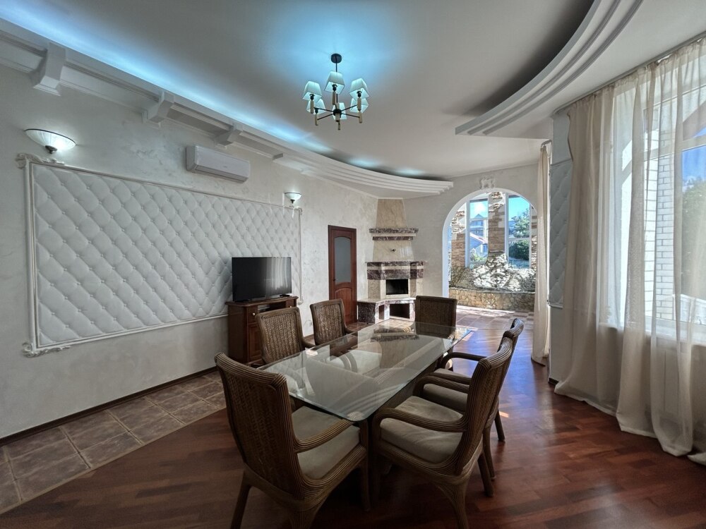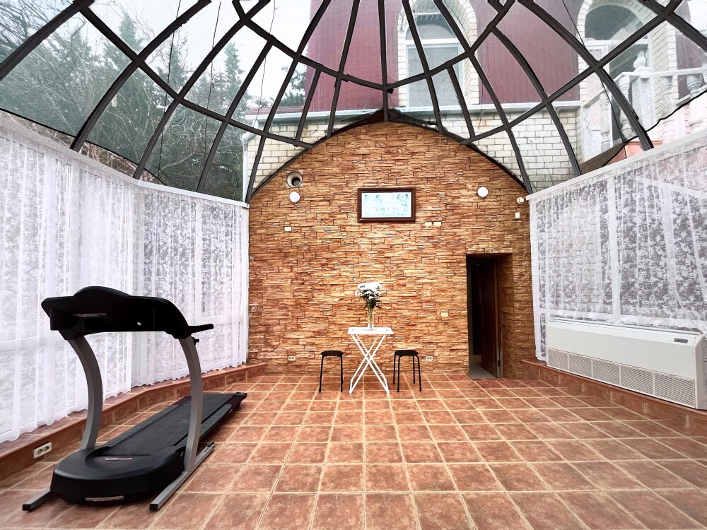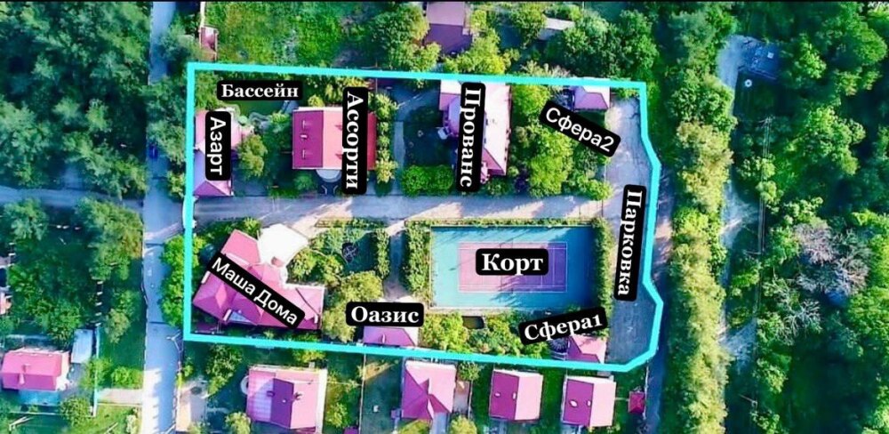 На большой, закрытой, зеленой территории комплекса две виллы и четыре дома, теннисный корт, большой открытый бассейн, банный комплекс, тренажерный зал, бильярд, зона для барбекю с местом отдыха, закрытая парковка. Коттеджи и территория идеально подходят для проведения свадьбы, юбилея, любого торжества. Территория 5000 м.