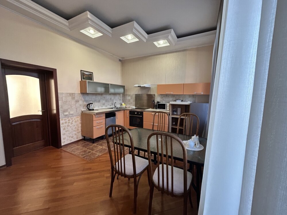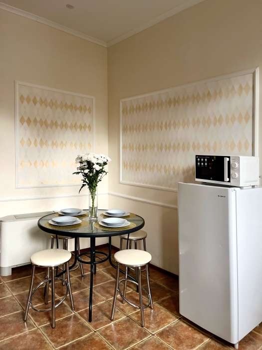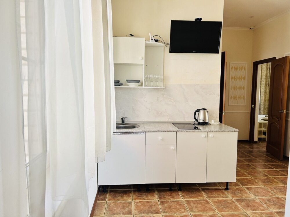 Оснащённая всем необходимым набором техники и посуды, она позволит вам готовить любимые блюда самостоятельно или проводить вечера за семейным столом.