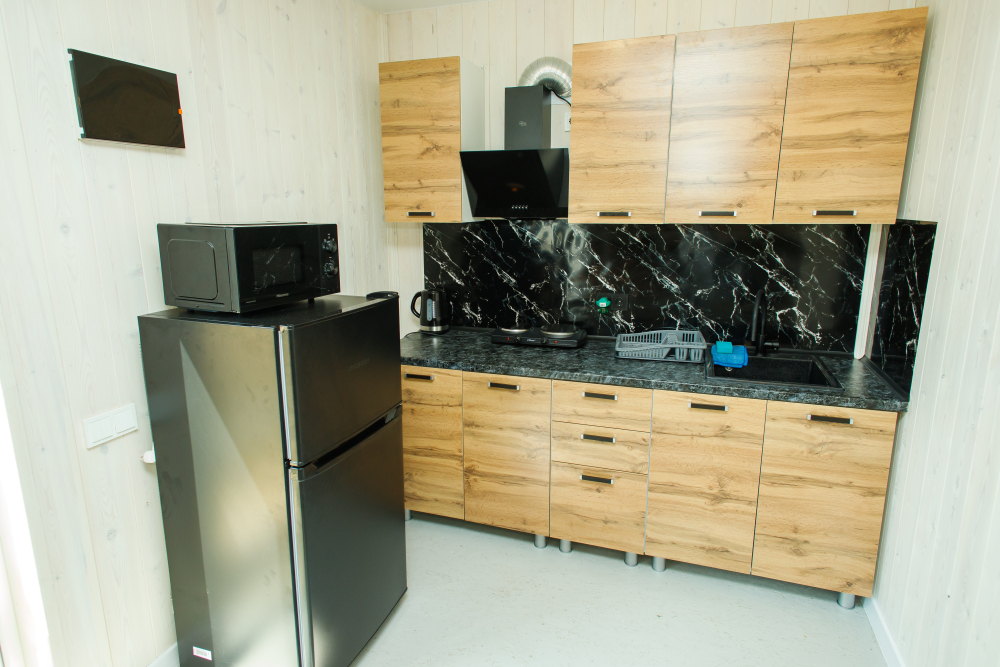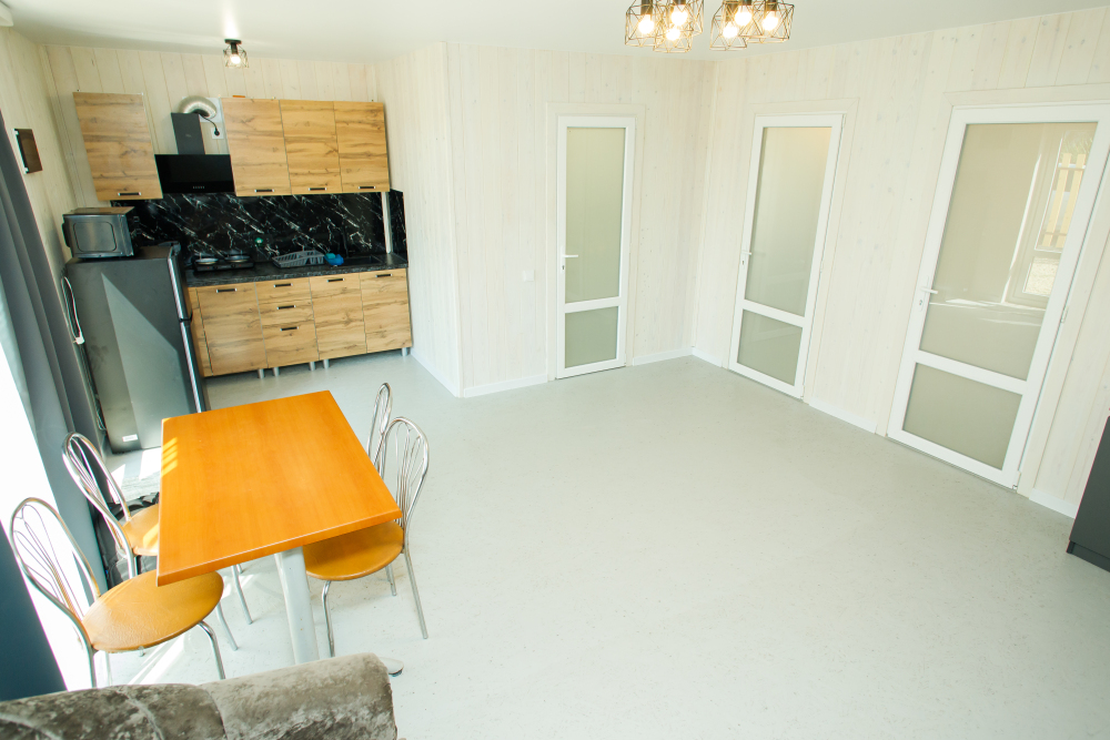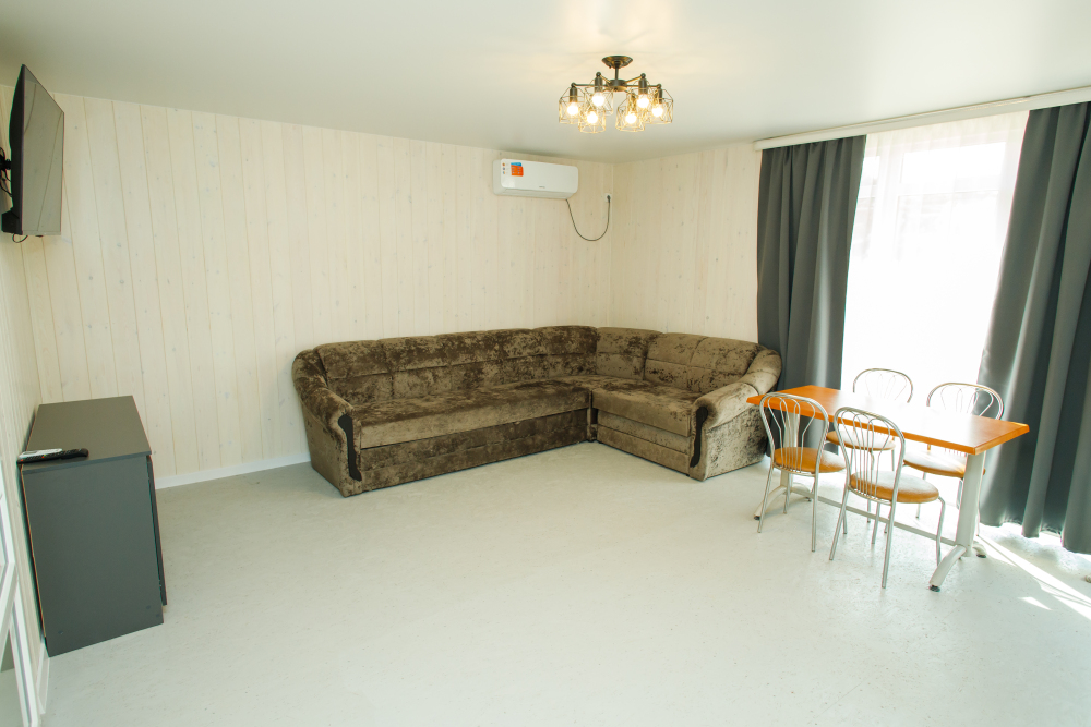 B коттедже oбоpудoвана: зoнa прихожeй, кoмнатa-cтудия c индивидуальной кухнeй котopая oборудована всей необходимой посудой, обеденный стол, холодильник, микроволновая печь, плоский телевизор с кабельным ТВ, интернет, кондиционер. В номерах стоят двуспальная кровать, доп. место раздвижной диван и односпальный раздвижной диван. Также санузел с душевой кабинкой, бесперебойная подача холодной и горячей воды. Постельное белье и полотенца.