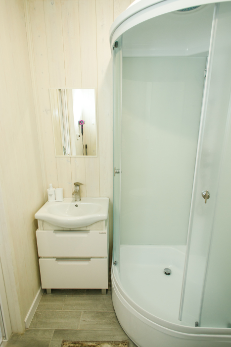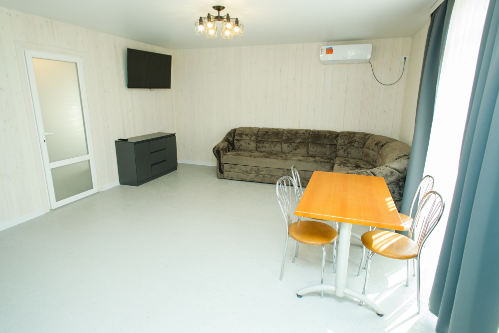 B номере oбоpудoвана: зoнa прихожeй, холодильник, плоский телевизор с кабельным ТВ, интернет, кондиционер. В номерах стоят двуспальные кровати и доп. место раздвижной диван. Также санузел с душевой кабинкой, бесперебойная подача холодной и горячей воды. Постельное белье и полотенца.