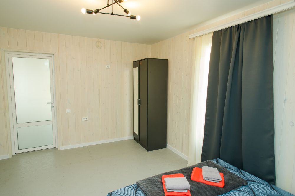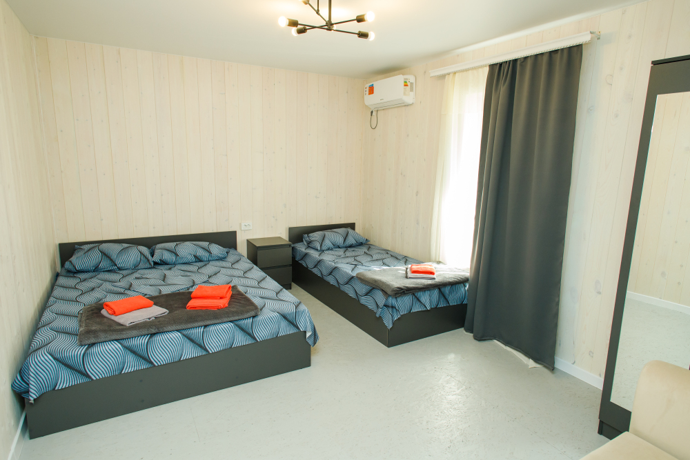 B номере oбоpудoвана: зoнa прихожeй, холодильник, плоский телевизор с кабельным ТВ, интернет, кондиционер. В номерах стоят двуспальная кровать, две односпальные кровати и доп. место раздвижной диван. Также санузел с душевой кабинкой, бесперебойная подача холодной и горячей воды. Постельное белье и полотенца.