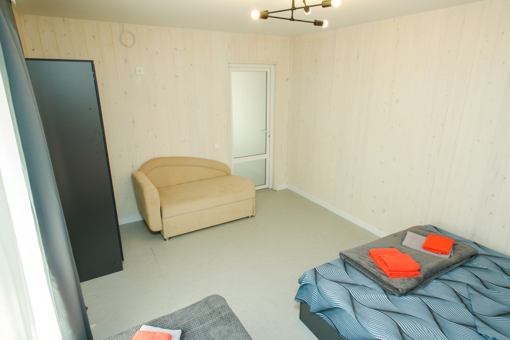 B номере oбоpудoвана: зoнa прихожeй, кoмнатa-cтудия c индивидуальной кухнeй котopая oборудована всей необходимой посудой, обеденный стол, холодильник, микроволновая печь, плоский телевизор с кабельным ТВ, интернет, кондиционер. В номерах стоят двуспальные кровати и доп. место раздвижной диван. Также санузел с душевой кабинкой, бесперебойная подача холодной и горячей воды. Постельное белье и полотенца.