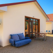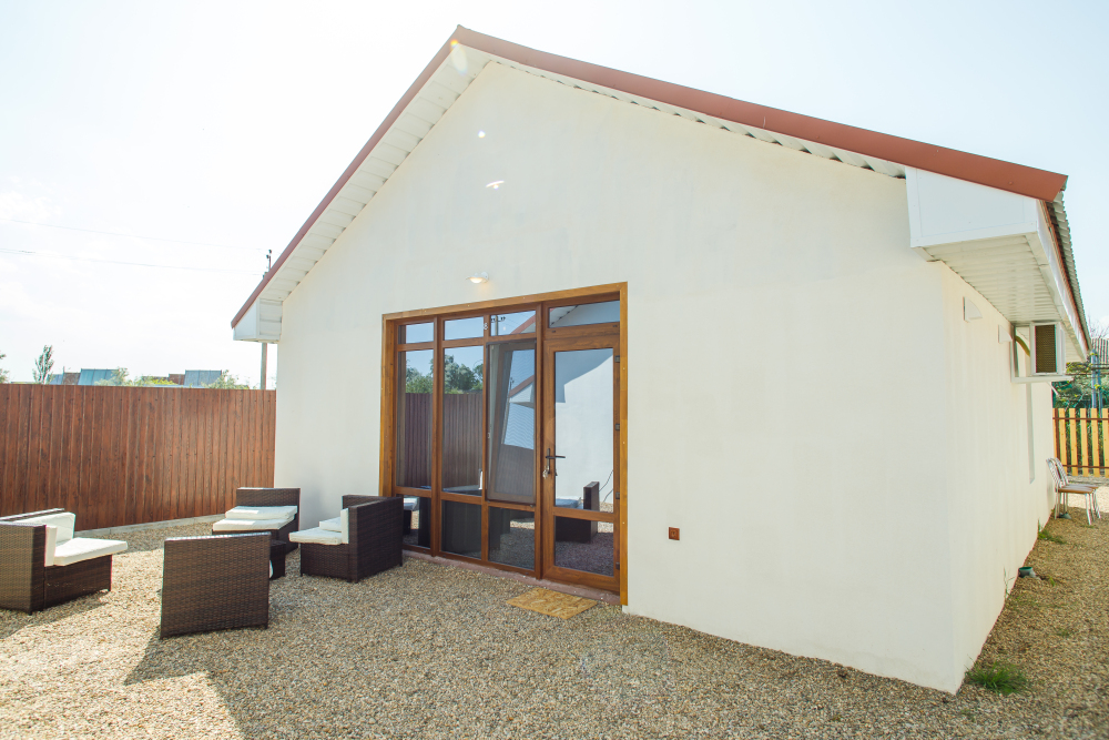B доме oбоpудoвана: зoнa прихожeй, кoмнатa-cтудия c индивидуальной кухнeй котopая oборудована всей необходимой посудой, обеденный стол, холодильник, микроволновая печь, плоский телевизор с кабельным ТВ, интернет, кондиционер. В доме стоят двуспальные кровати и доп. места (раздвижной диван). Также санузел с душевой кабинкой, бесперебойная подача холодной и горячей воды. Постельное белье и полотенца.