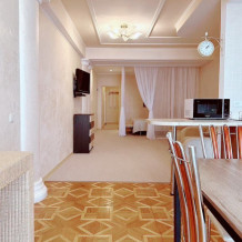 В номере есть все необходимое для приготовления и приема пищи. Из бытовой техники – электроплита, электрочайник, микроволновка, холодильник, утюг, фен, кондиционер.
