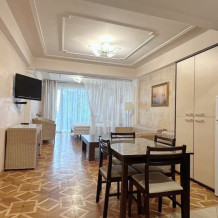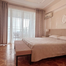 Вас ожидает спокойный отдых для семьи из 4-6 человек. В апартаментах есть зона спальни с двуспальной кроватью, зона отдыха с раскладными диваном и креслами, санузел и зона кухни, что позволяет отдохнуть и при желании приготовить завтрак, обед и ужин.