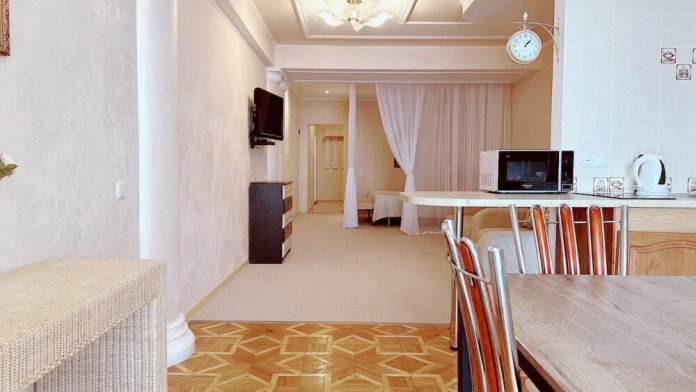 В каждом апартаменте есть зона спальни и кухни, что позволяет и отдохнуть, и при желании приготовить завтрак, обед или ужин.