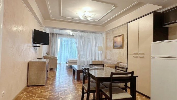 В апартаментах есть раскладной диван, раскладное кресло, санузел и зона кухни, что позволяет отдохнуть и при желании приготовить завтрак, обед и ужин.