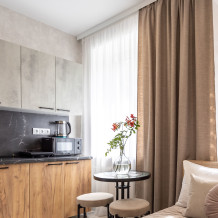 Студия подходит для 1-2 человек. По классике наших апартаментов есть всё, что может понадобится в повседневной жизни. Начиная от скоростного wi-fi, бытовой техники и заканчивая средствами гигиены.